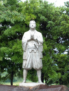 Beyond the cherry trees, overlooking the sea, stands a very different Amakusa Shiro: a stout young man in prayer with two swords in his belt. This statue is truer to history, more like the young samurai who stood here awaiting the holocaust in that horrific cherry-blossom spring of 1638. Here thirty-seven thousand souls would offer up their starving flesh, writing their testament in blood into this sacred soil. Here was Hara Castle, the grave of the Shimabara Rebellion, the dying gasp of old Catholic Japan.